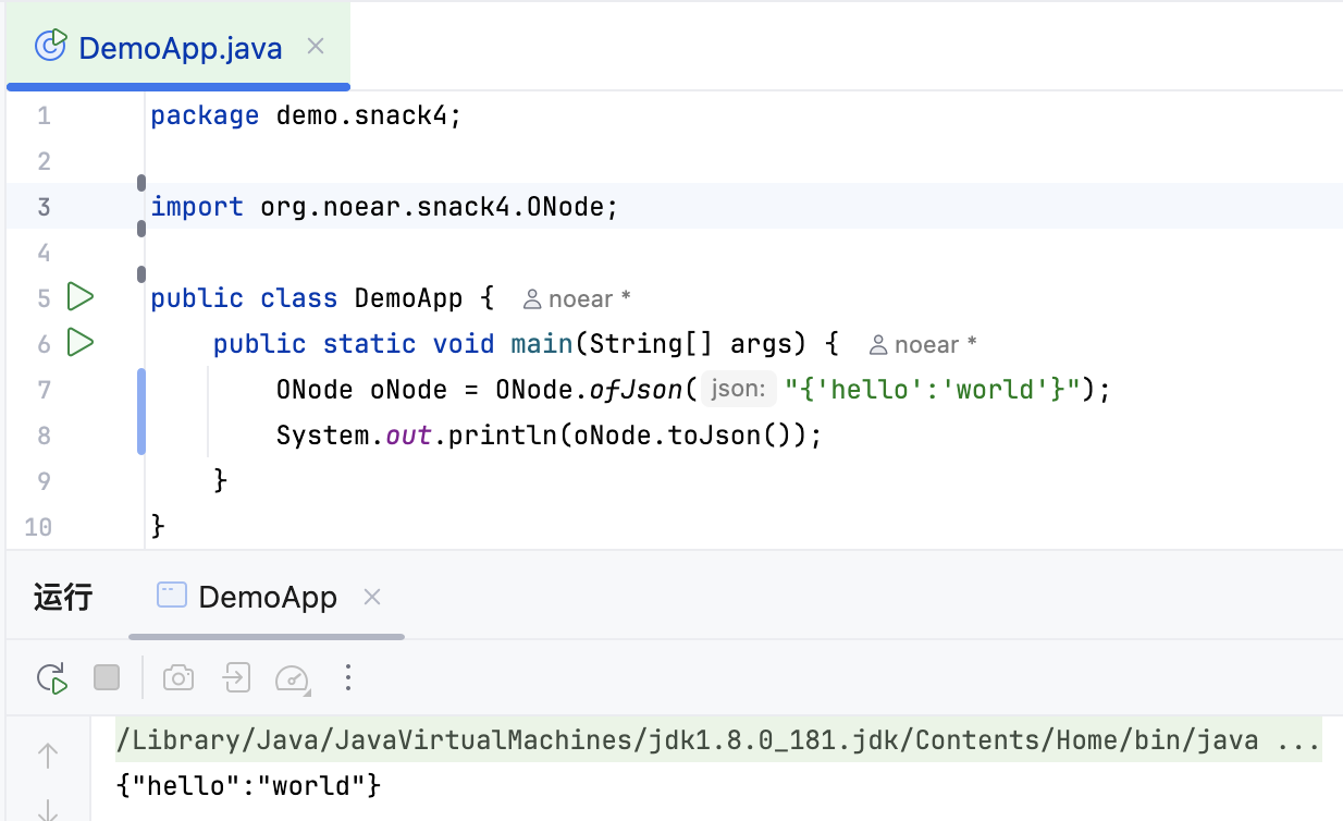 ONode oNode = ONode.ofJson("{'hello':'world'}");
