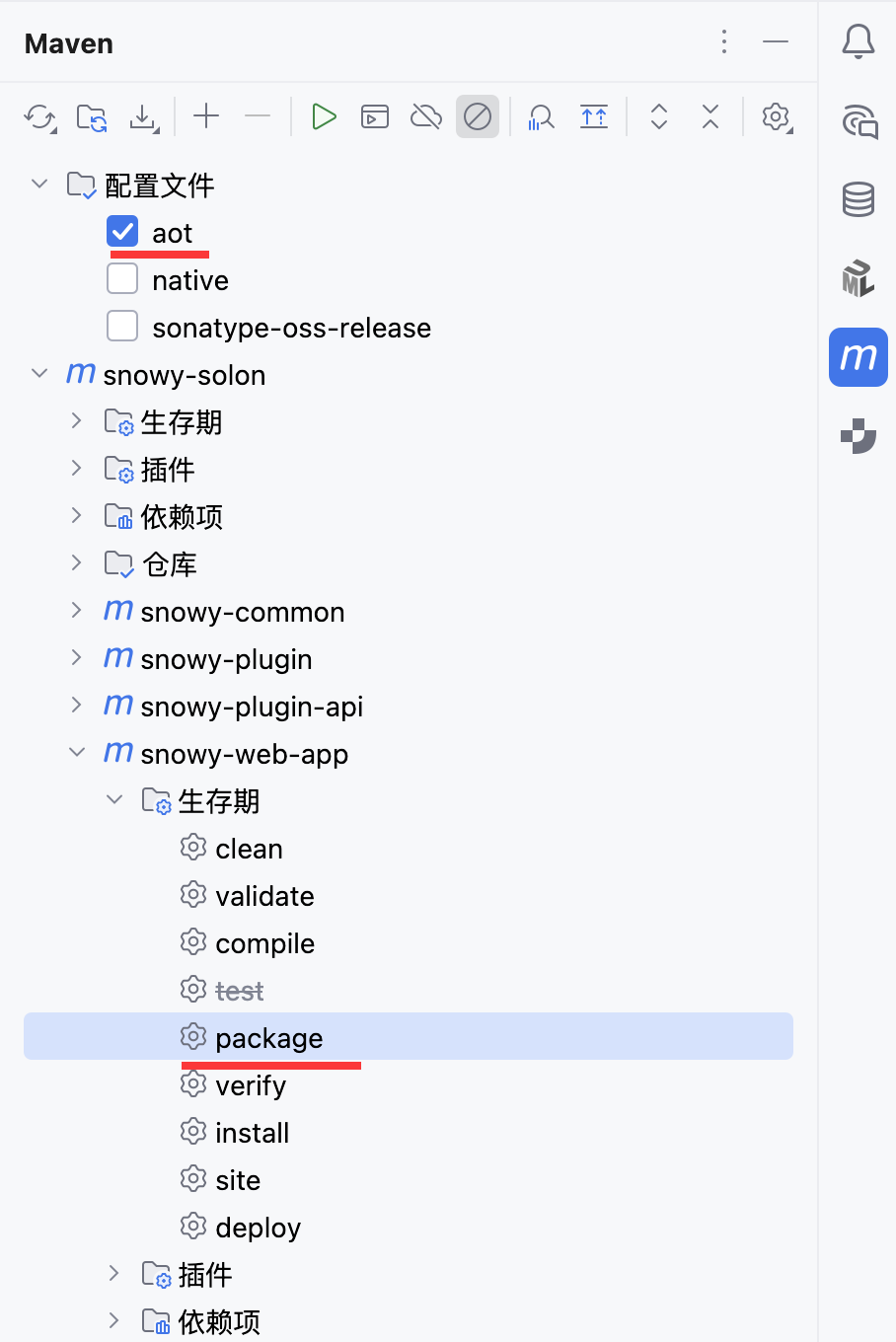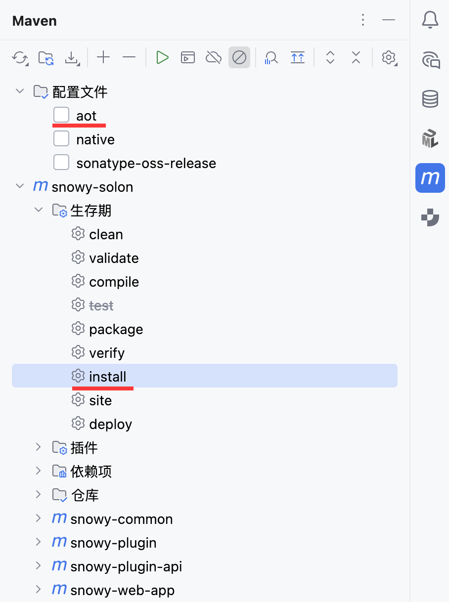 | 不要勾选 aot,(所有模块)执行 mvn install 命令 | 勾选 aot,(主模块)执行 mvn package 命令 |