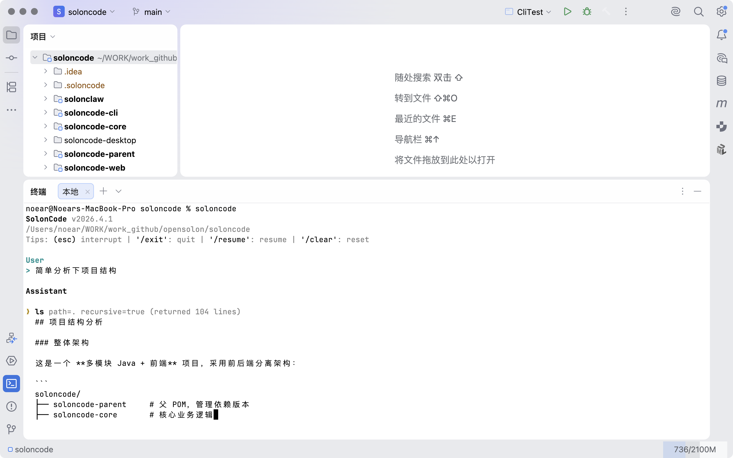 SolonCode CLI 可在任意 IDE 的终端中使用,无需安装额外插件。