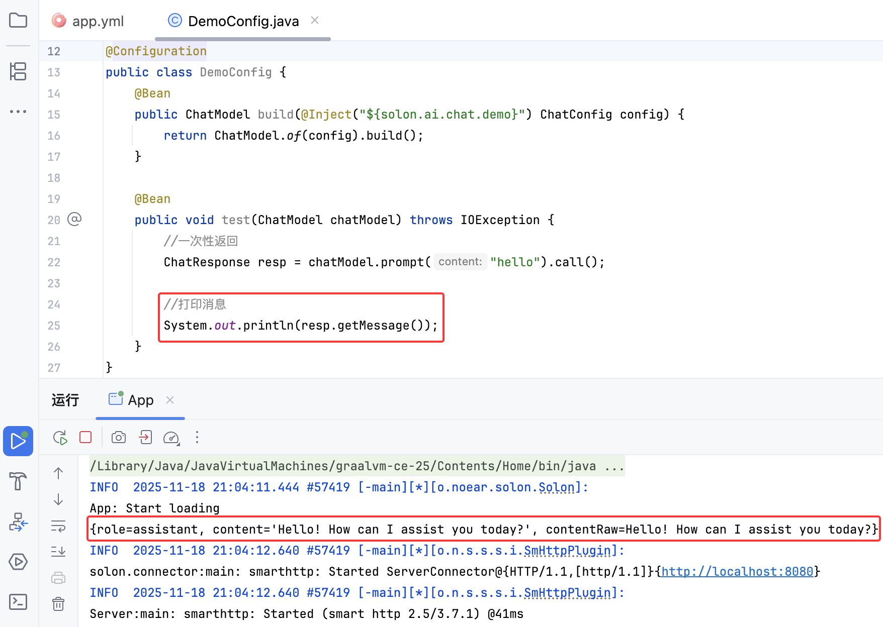 在项目里,添加一个 DemoConfig。概构建 ChatModel,也做测试。